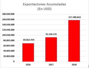 Las exportaciones acumuladas año a año también han tenido un dramático crecimiento. Solo el año pasado tuvimos un incremento del 41 % entre el 2016 y el 2017. Este año de vuelta tenemos una promesa importante, ya que en este primer trimestre vamos exportando más de un tercio de lo que se exportó en todo el año pasado.